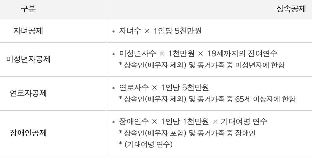 - 장애인 공제: 상속인 중 장애인이 있으면 장애인 1명당 (기대여명 × 1천만 원)만큼 추가 공제