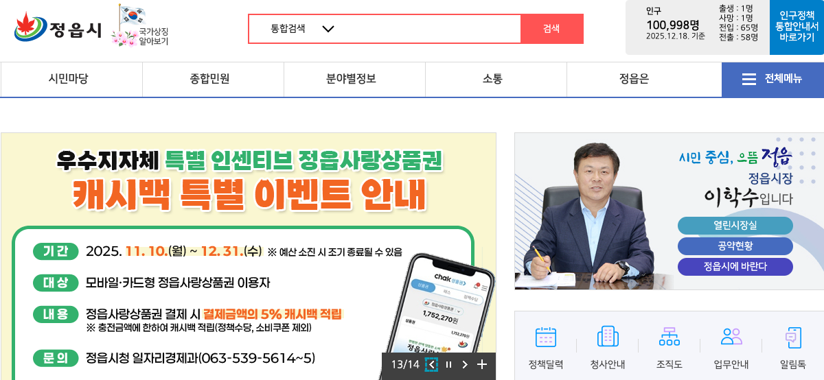 정읍시청 홈페이지는 시민이 참고할 수 있는 행정 정보와 민원 안내를 온라인으로