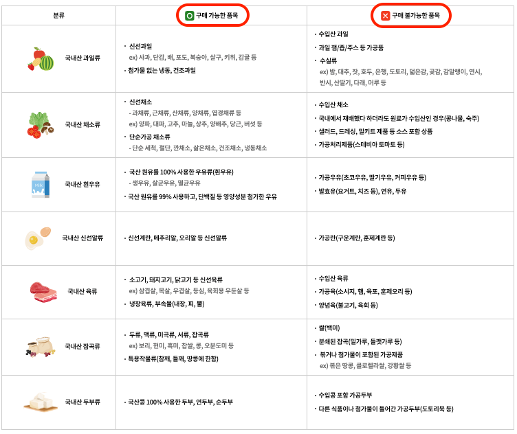 온라인 이용 시에도 운영 기준에 따라 국산 농식품 중심 품목으로