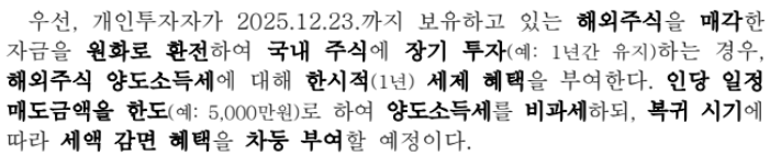 해외주식 매각 후 국내 투자로 전환하는 일정 조건을 충족할 경우, 양도소득세