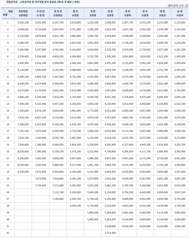 2026년 경찰공무원 봉급표는 계급과 호봉에 따라 월 기본급이 지급되는 체계