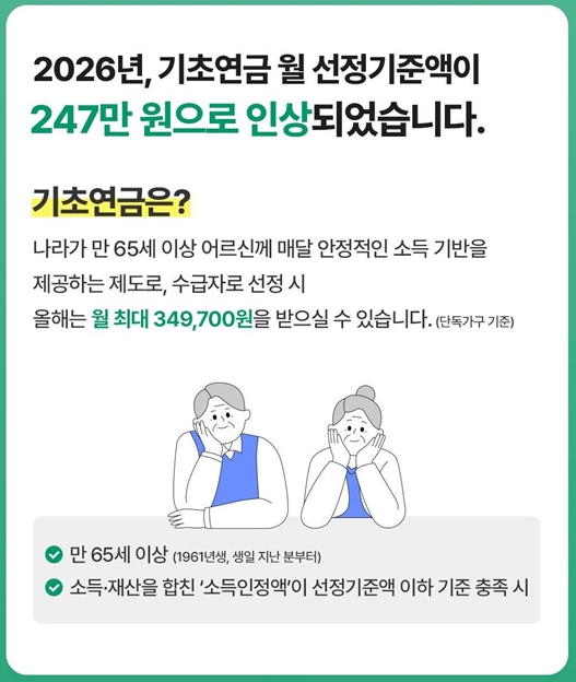 2026년 기초연금 선정기준액은 노인의 소득과 재산 여건 변화를 반영해 조정되었습니다.
