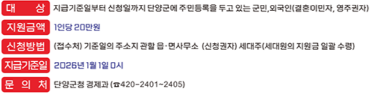 2025년 12월 31일 기준 단양군에 주민등록이 있고 신청 시점까지 거주 요건을