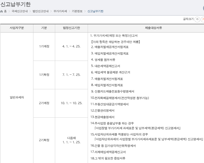 | 일반과세자 | 제1기: 1.1 ~ 6.30 | 7월 1일 ~ 7월 25일 |
