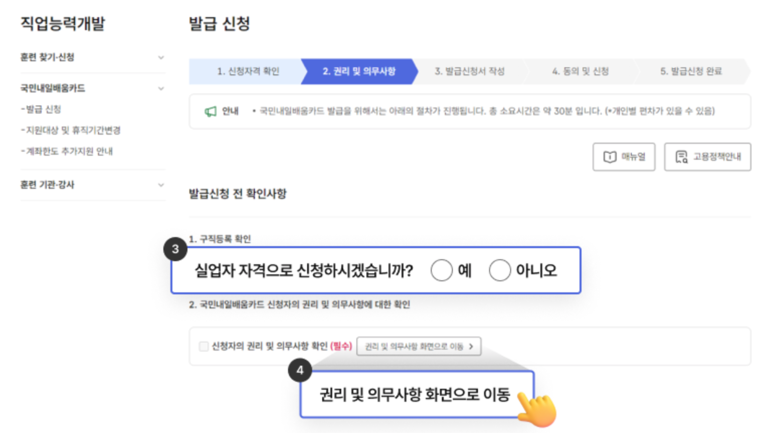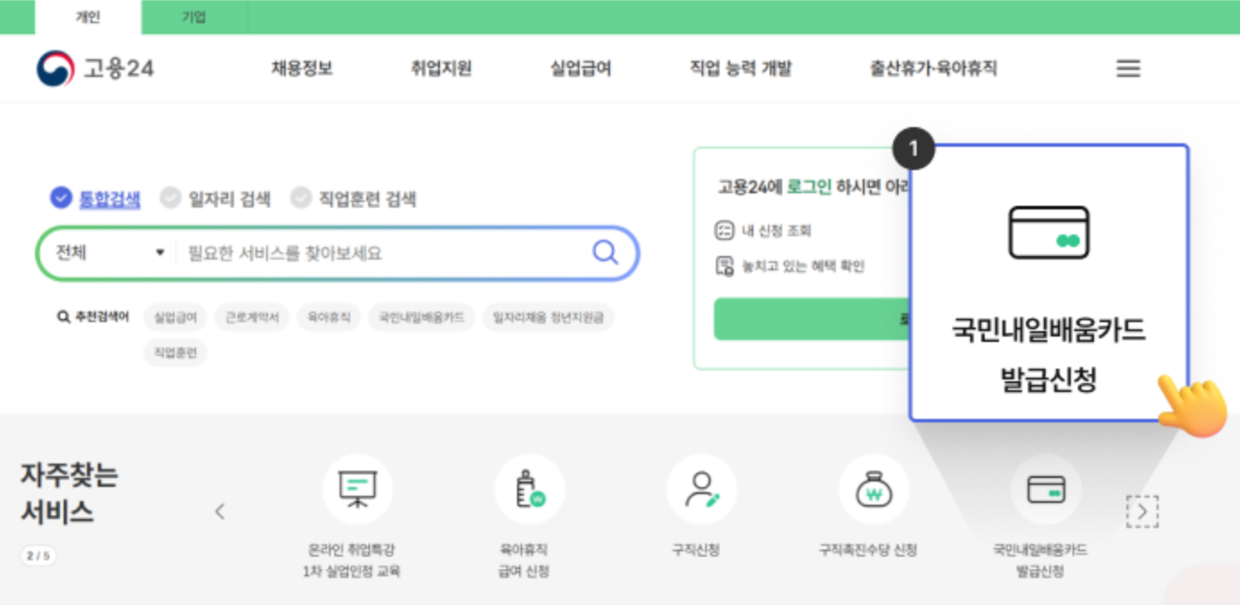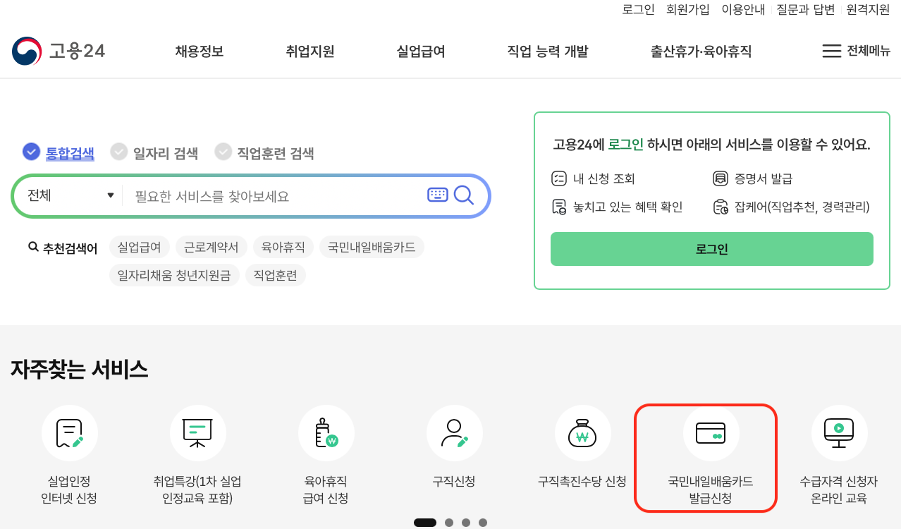 고용24에서 회원가입 후 인증서를 통해 로그인하고 신청서 작성 및 서류 제출 후 심사를 받으면 카드가 발급됩니다.