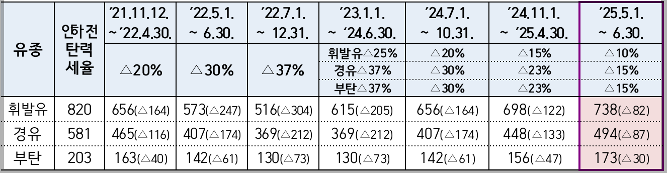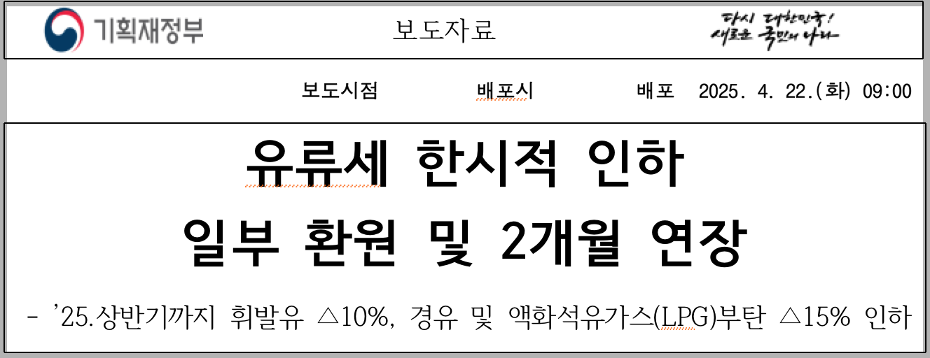 - 2025년 4월 30일에 종료 예정이던 유류세 인하 조치가 2025년 6월 30일까지 연장