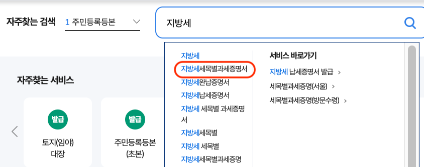 2. 상단 검색창에 '지방세 세목별 과세증명서' 입력