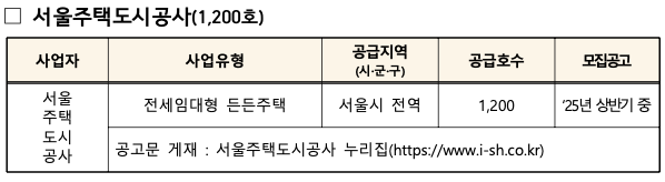 - 서울주택도시공사(SH): 2025년 상반기 중 1,200호 모집 예정