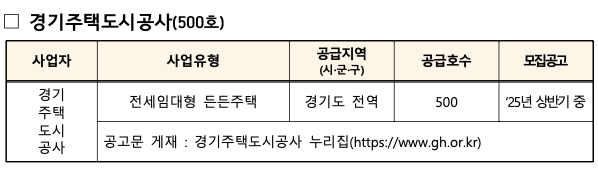 - 경기주택도시공사(GH): 2025년 상반기 중 500호 예정