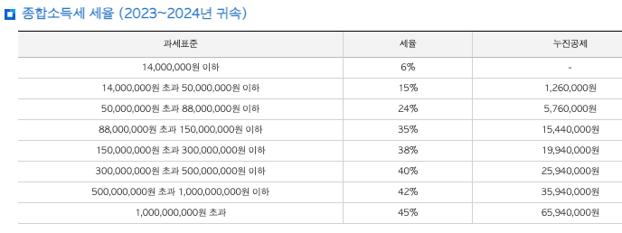 ◆ 세율은 6%부터 45%까지이며 과세표준 구간에 따라 적용되고 누진공제로 세 부담이 조정됩니다.