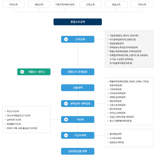종합소득세는 여러 가지 소득을 합산한 뒤 공제와 세율·누진공제·세액공제·기납부세액 등을 순차적으로 반영해 최종 납부세액을 계산합니다.