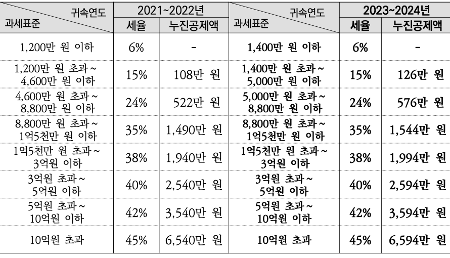 - 근로소득·사업소득·임대소득 등과 함께 합쳐서 누진세율(6~45%) 적용